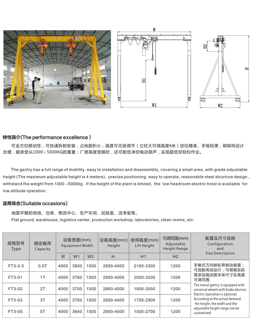 性能優點:該款產品具有結構簡單、可靈活組裝和轉運、可移動性強、經濟實惠及安全性能高等優點,能承受從1000~5000KG的重量;廠房高度受限時,可配低凈空電動葫蘆,實現超低空輕松作業。