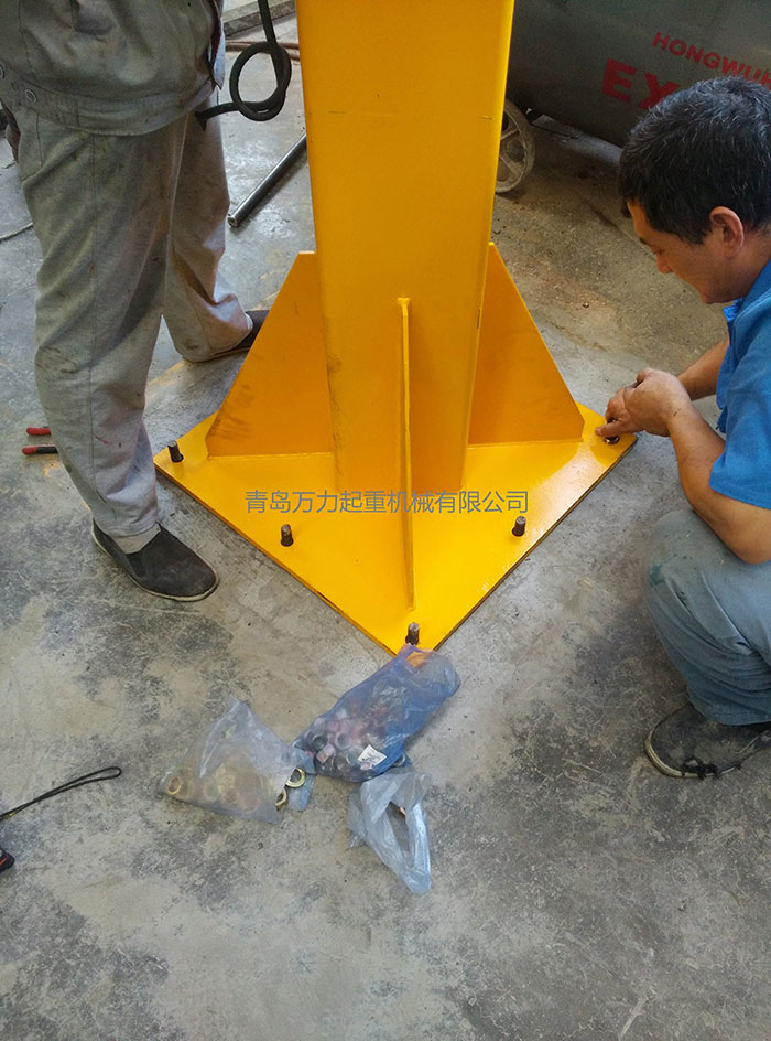 立柱式旋臂吊立桿選用方管或圓鋼管生產制造,兩邊分別電焊焊接底版和圓弧,上端安裝腰圈路軌。底版根據化學螺栓與水泥地面聯接固定不動,確保懸臂吊的可靠性。圓弧上打有形孔,建立電纜線從立桿內部隱蔽工程裝線。